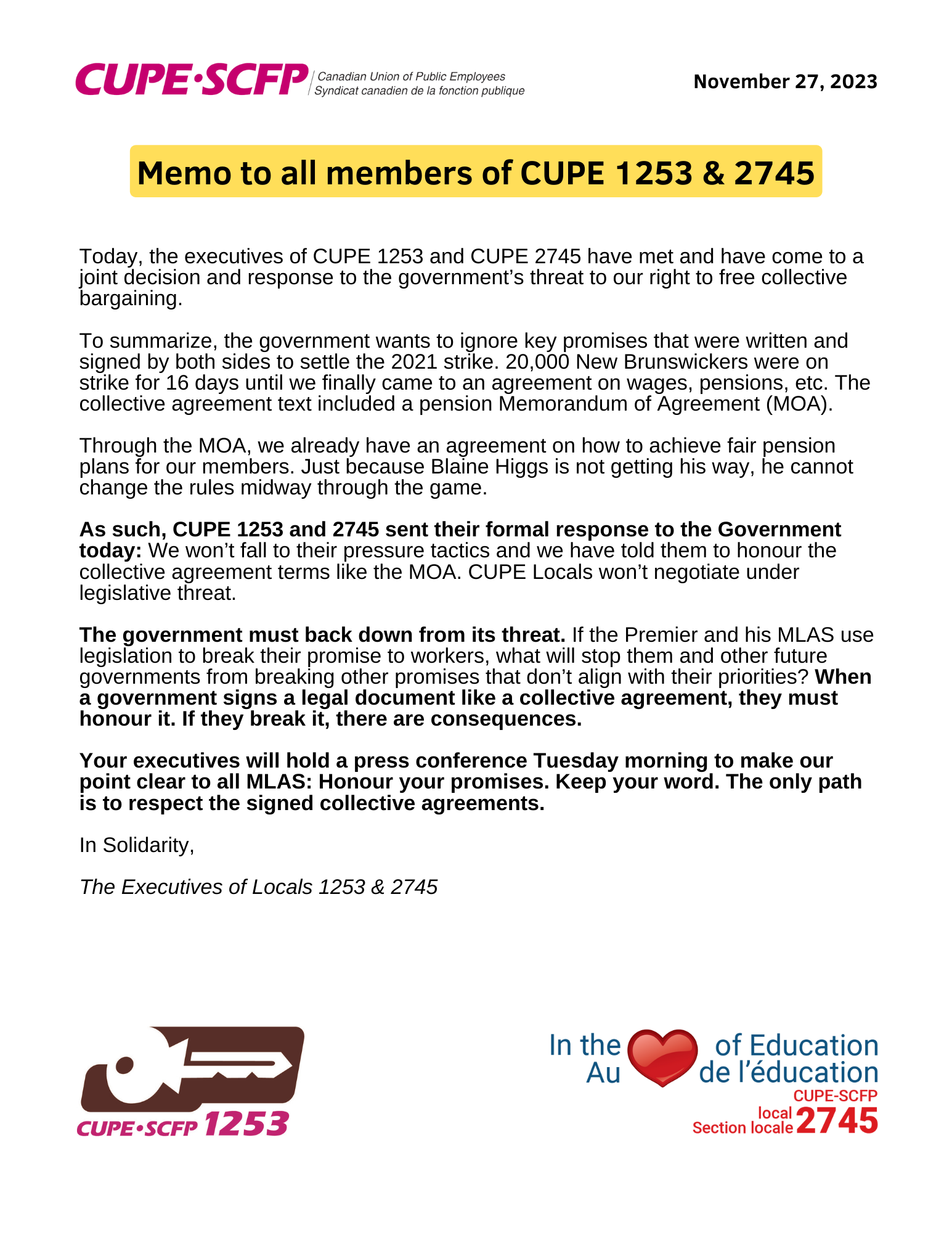 Please read memo to all CUPE 1253 and 2745, Stay tuned and informed